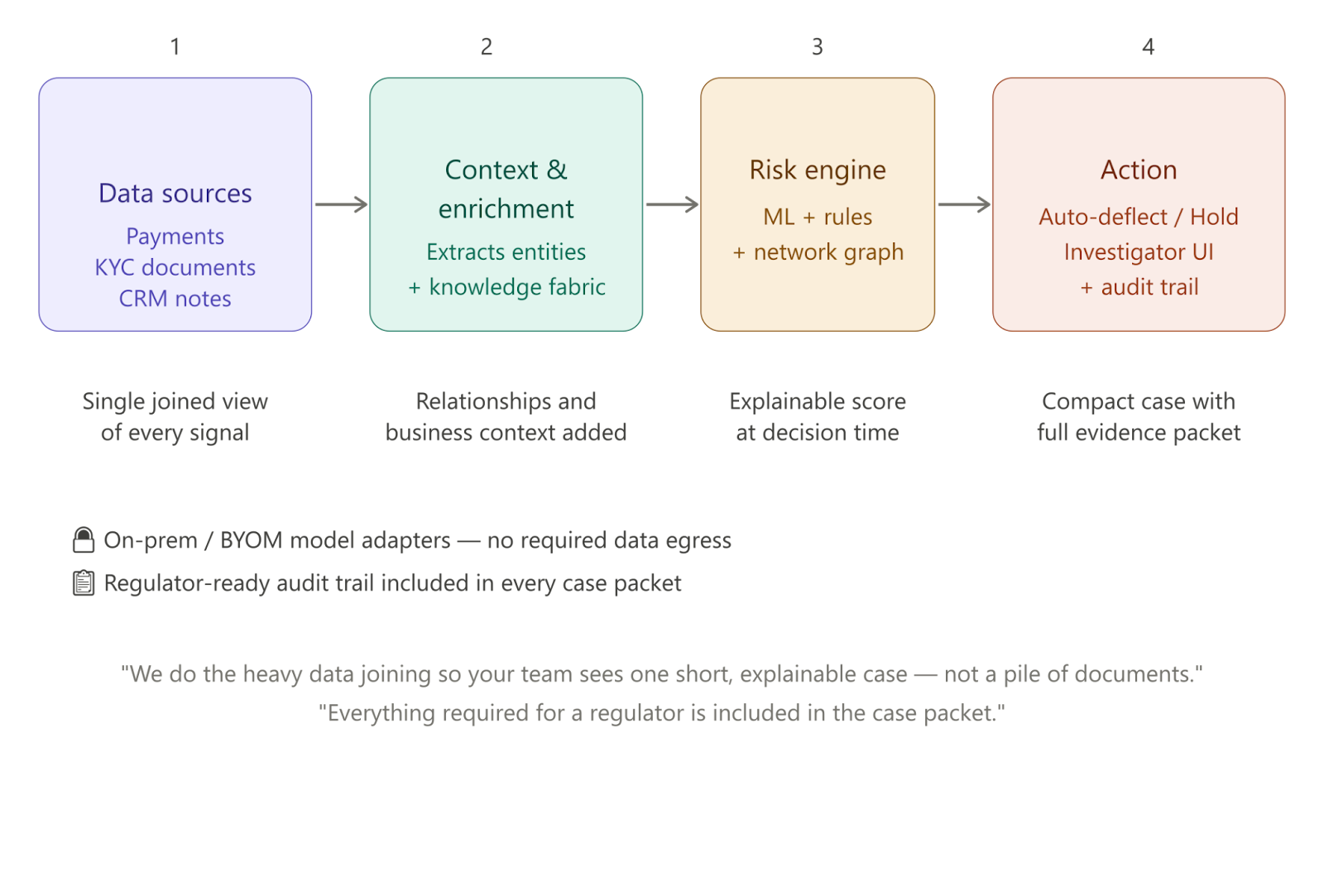 Data from payments, KYC files, and customer interactions is unified and enriched with context - relationships, patterns, and historical signals. Risk is then assessed in real time using a combination of models, rules, and network analysis.