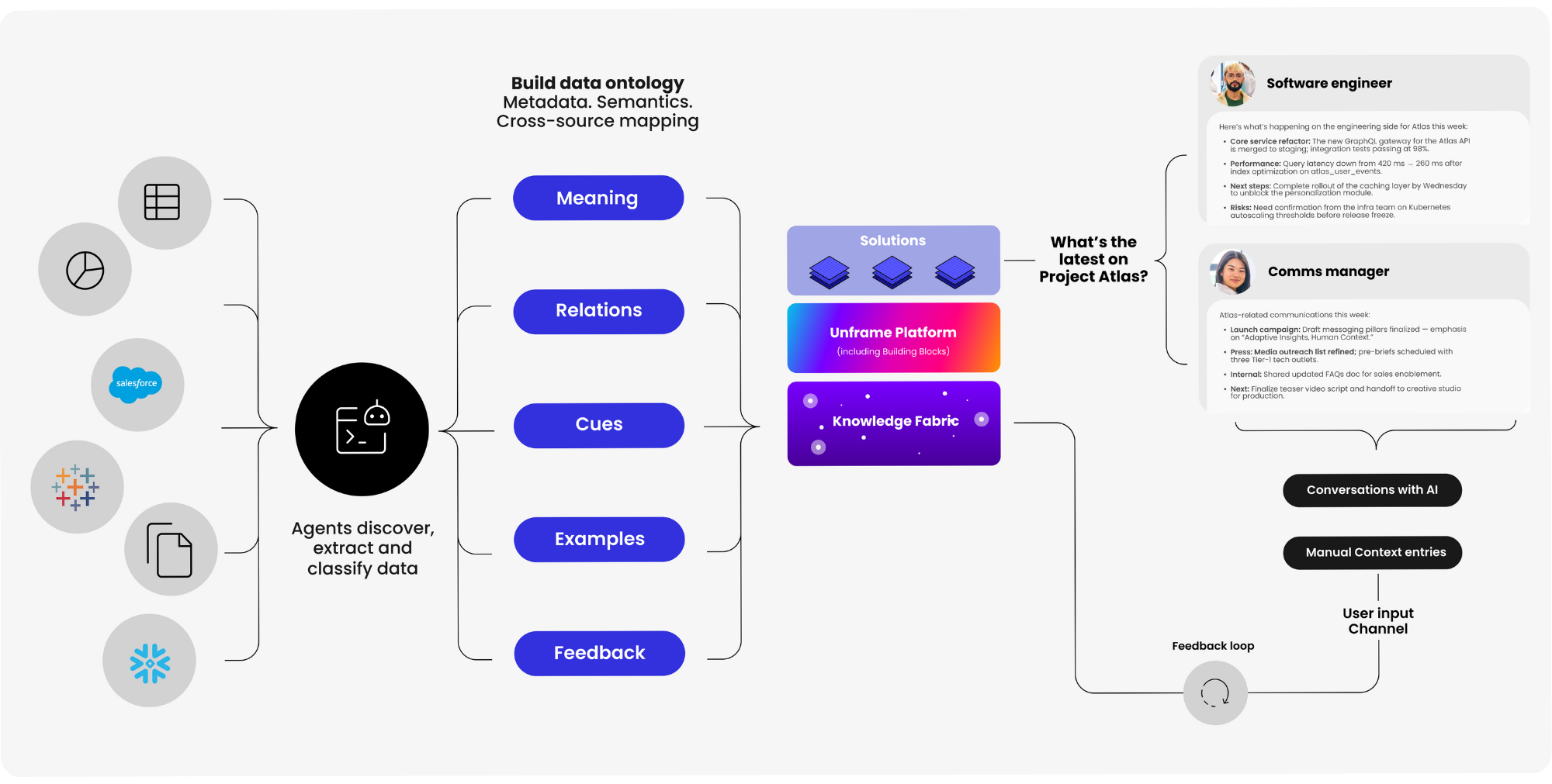 The enterprises getting real value from conversational AI have invested in the foundation layer first. For example, with a Knowledge Fabric instance from Unframe, your organization gets a semantic layer purpose-built for AI.