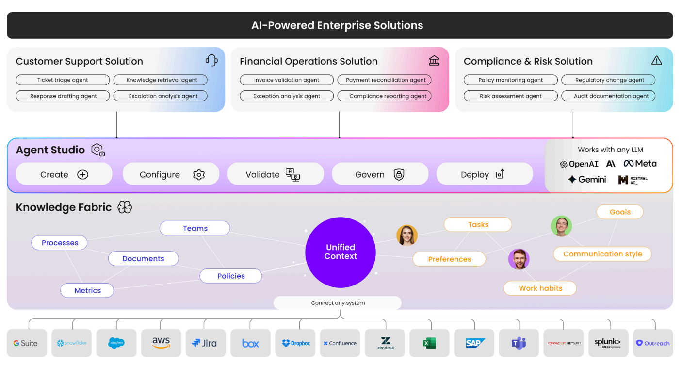 4. Knowledge stays siloed. Agents trained or configured in isolation don't share context. An agent in finance doesn't know what the operations agent knows. This creates inconsistency in outputs, redundancy in data access, and a fragmented experience for the end user.