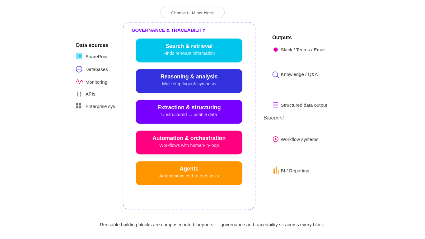 A blueprint defines which building blocks to use and how they connect. It specifies data sources to integrate, which LLM to use for each component, governance rules and guardrails, and output formats and destinations. The blueprint is a spec file that orchestrates everything needed for a complete solution.