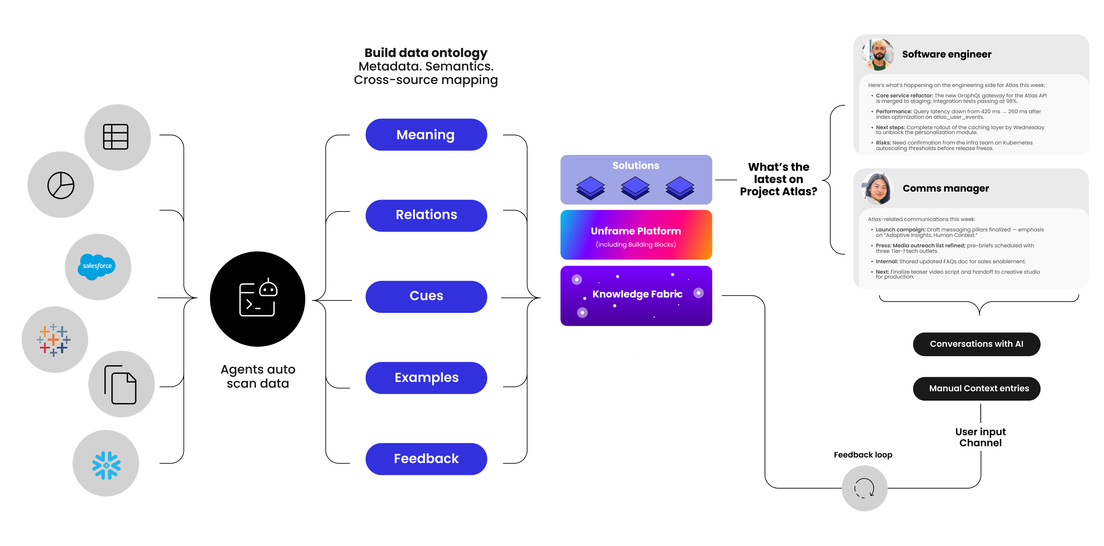 Unframe’s Knowledge Fabric turns enterprise context into a first-class part of the AI architecture. It connects data sources, business taxonomies, and operational metadata into a unified graph of meaning. This allows models, agents, and decision systems to reason about the enterprise itself — replacing much of the manual translation work once done by FDEs.