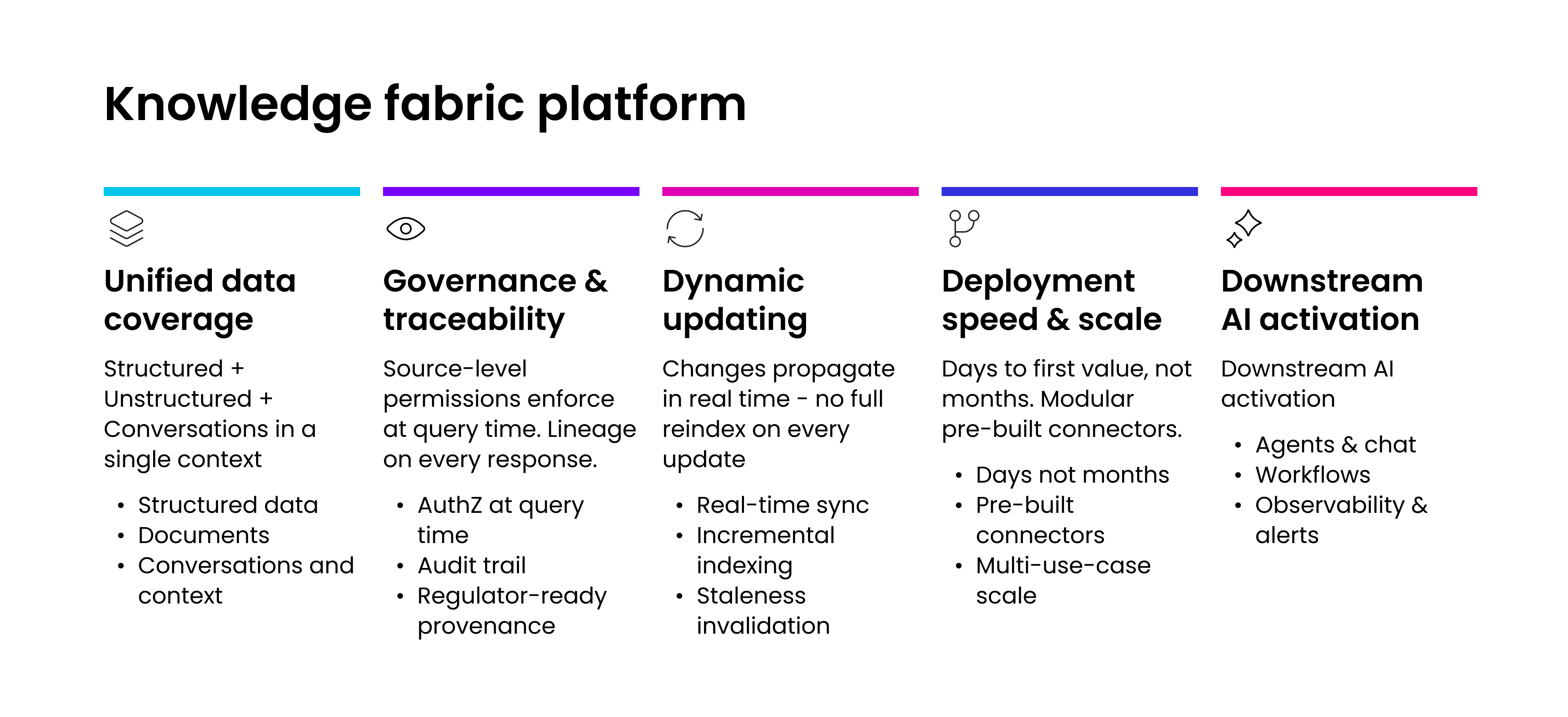You’ll also need to look at how the platform handles change. Enterprise knowledge evolves continuously. Documents are updated. Organizational structures shift. Regulatory requirements change. A knowledge fabric that requires full reindexing when the underlying data changes is a liability in a fast-moving enterprise. Dynamic updating, where changes propagate through the context layer in real time, is essential for keeping AI responses current and trustworthy.